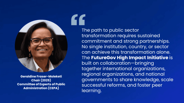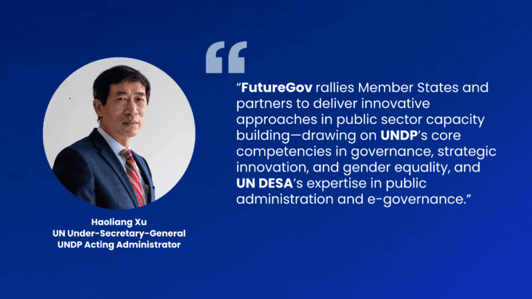 As a dynamic initiative, FutureGov is designed to support Member States in their “transformation journeys” as they improve the way they design, finance, deliver, and evaluate public services. The initiative brings Member States, partners and experts together in a conversation on the centrality of public sector transformation, while allowing Member States to share capability–building experiences and reiterate commitment to public sector transformation moving forward. FutureGov focusses on three elements of public sector transformation–through prioritized capabilities that can shift over time in response to the evolving development needs of Member States.